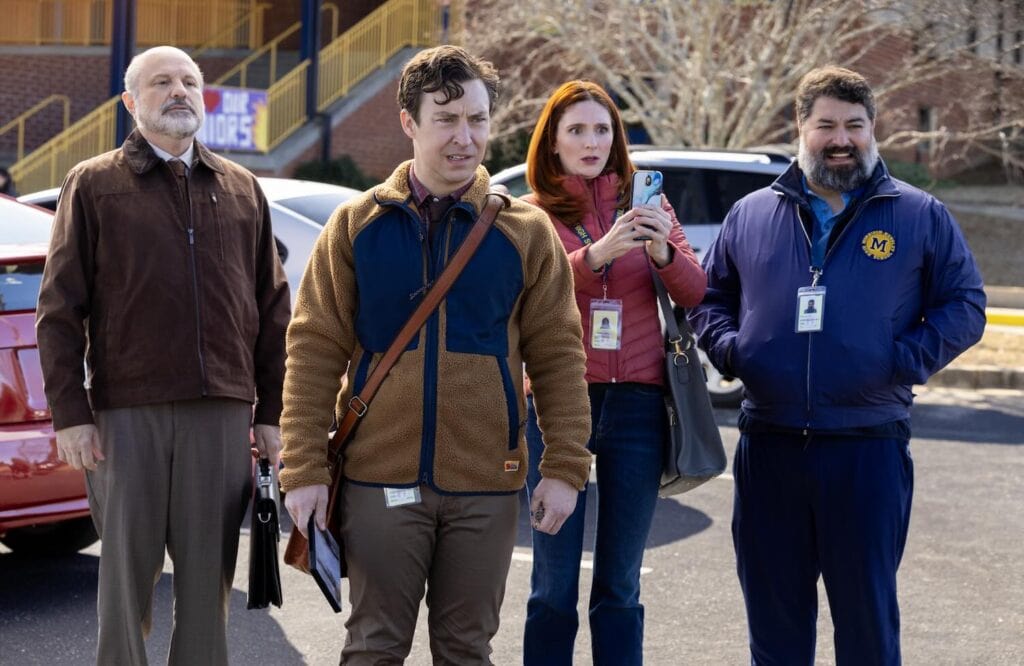 The season maintains English Teacher’s knack for using hot-button issues as a jumping off point to, rather than self-righteously satirize one side or another, engage in silly bits of business. So a debate about affirmative action devolves into Evan obsessing over whether he might be a “DEI hire,” while a reflection on Covid turns into a lesson about the humiliation of putting on a bad school play.