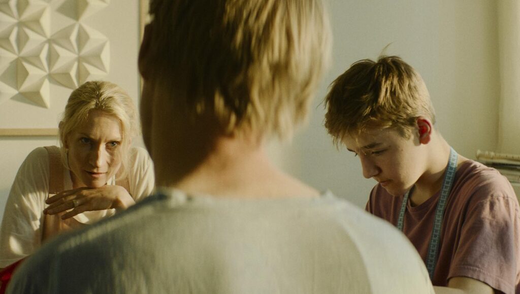 One may wish that Sex was exclusively about this couple, as their struggle to reconcile whether or not five minutes of anonymous sex defines their relationship is far more compelling, and funny, than the boss’s dilemma about what his dreams of David Bowie may say about his sexuality. He discusses it with his wife (Birgitte Larsen), who struggles to even comprehend why the dreams are so troubling to him. Between the man laying out that Bowie doesn’t look at him as either a woman or a man, his earlier admission of feeling embarrassed to be seen with his wife when she was pregnant because that meant onlookers would know that they had sex, and a series of dramatically inert conversations that he has with his teenage son (Theo Dahl), it’s generally unclear what Haugerud is trying to say about him.