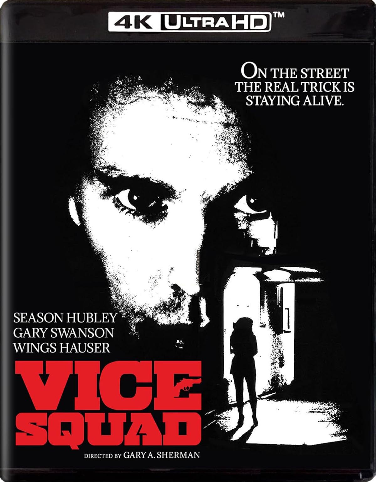Even grindhouse aficionados keep their pinkies in the air when referring to Vice Squad, and that’s due in large part to John Alcott’s truly dynamic, neon-lit cinematography. Sourced from a new 4K scan of the original camera negative, Kino Lorber’s UHD presentation is certainly the best the film has looked since its original theatrical release, delivering the finely wrought grime in a transfer that strongly emphasizes the fine grain of the 35mm source material. The color palette is steely, and the nighttime streets consistently glisten with fresh, photogenic precipitation. It’s a teeming, tactile transfer overall. The sound mix is available in either 2.0 lossless stereo or 5.1 surround, and both tracks are eminently capable of rising to the high bar set by Wings Hauser’s sound and fury as the vengeful, idiotic Ramrod.